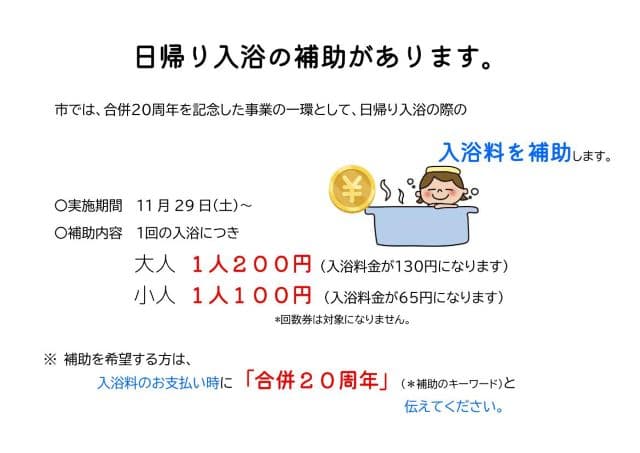 市では、合併20周年を記念した事業の一環として、11月29日から日帰り入浴の際の入浴料を補助します。