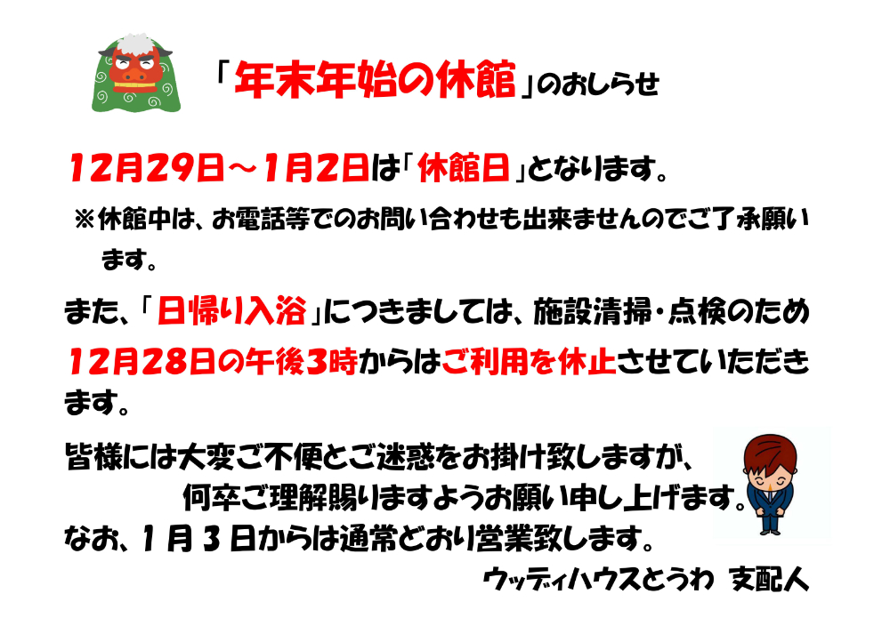 また、「日帰り入浴」につきましては、施設清掃・点検のため12月28日の午後からはご利用を休止させていただきます。