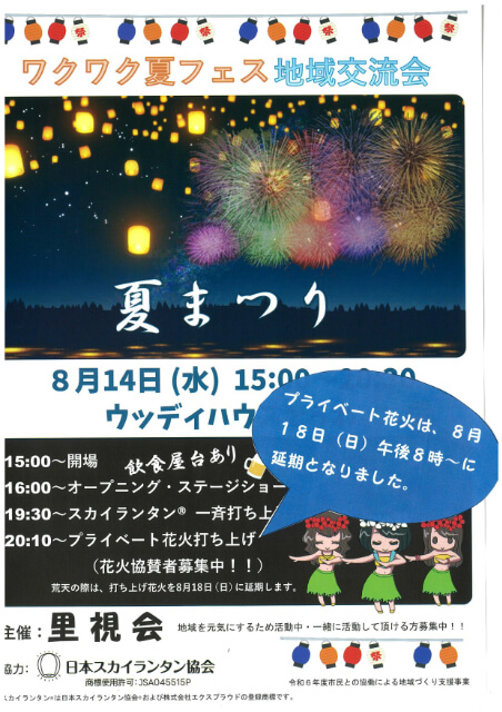 8月14日に実施予定でありました、ワクワク夏フェス地域交流会の「プライベート花火打上げ」につきましては、荒天により「8月18日(日)午後8時~」に延期させて頂きました。