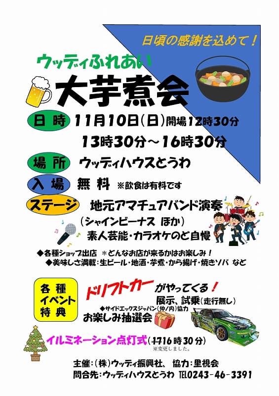 11月10日(日)に予定しておりますイルミネーション点灯式の時間を、当初の午後5時から「大芋煮会」が終了する午後4時30分に変更いたします。