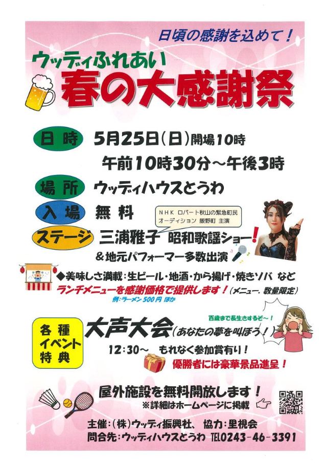 当日は、ステージイベントとして、ロバート秋山の番組で一躍話題の人となった「三浦雅子さん(飯野町)」をお迎えしての歌謡ショーや、多彩なゲストをお迎えしております。ほか、「大声大会」として、あなたの夢を大きな声で叫んでいただき、優勝者には豪華景品が贈られます。心に秘めたあなたの夢を是非聞かせてください。